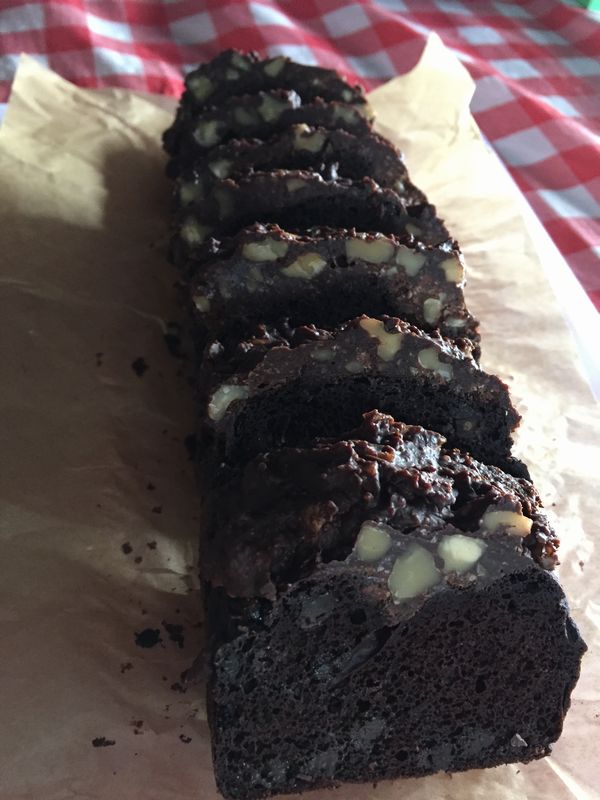 カカオパウダーと梅酒入りの自家製天然酵母で膨らませたパウンド生地にくるみ入りのチョコレートたっぷり掛けた、これぞ THE チョコレートケーキ。