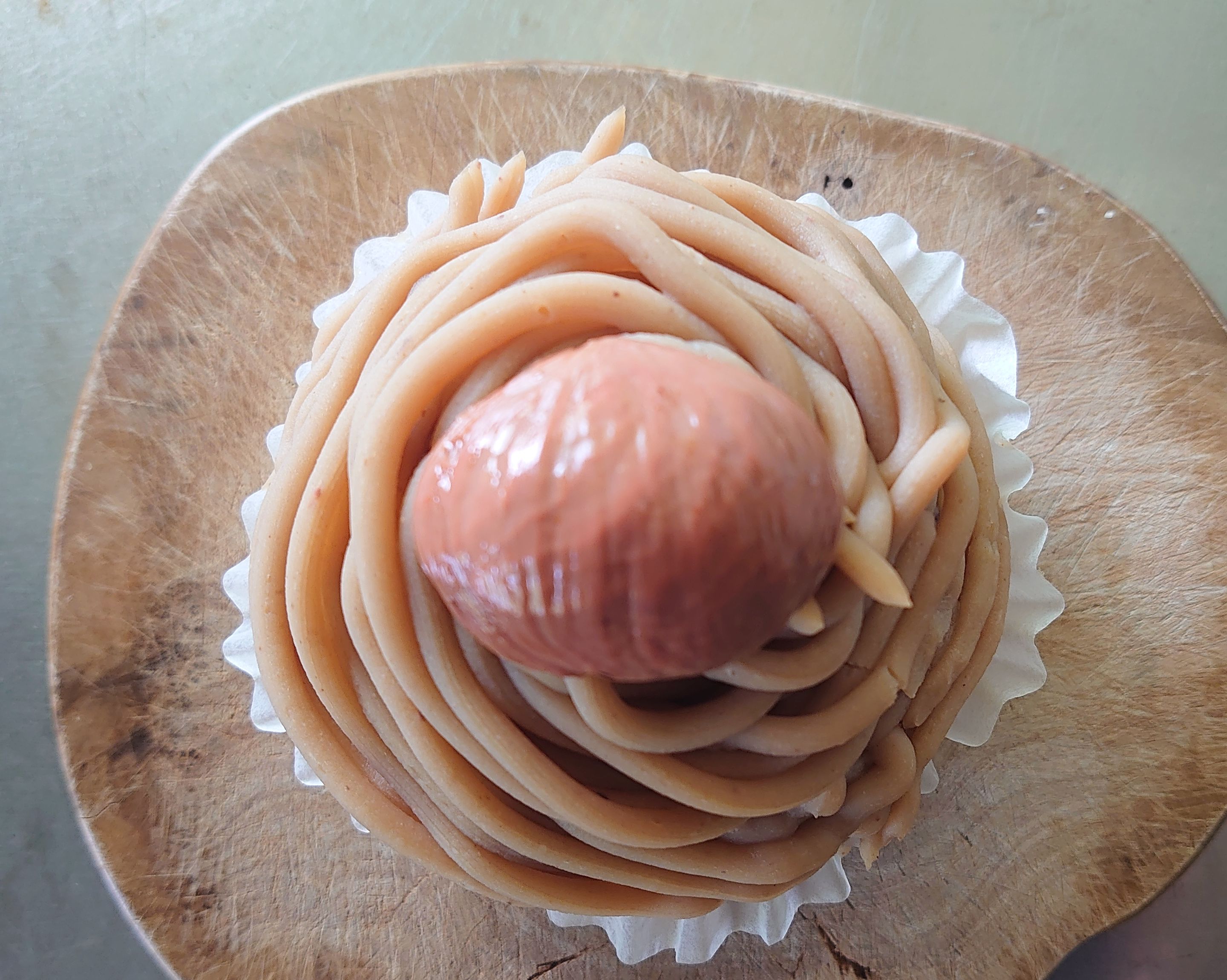 土台はさつまいもケーキ、その上に栗の渋皮煮が丸ごと1個入った豆乳クリームを乗せ、その上に栗100%の栗クリームをたっぷり巻いています。